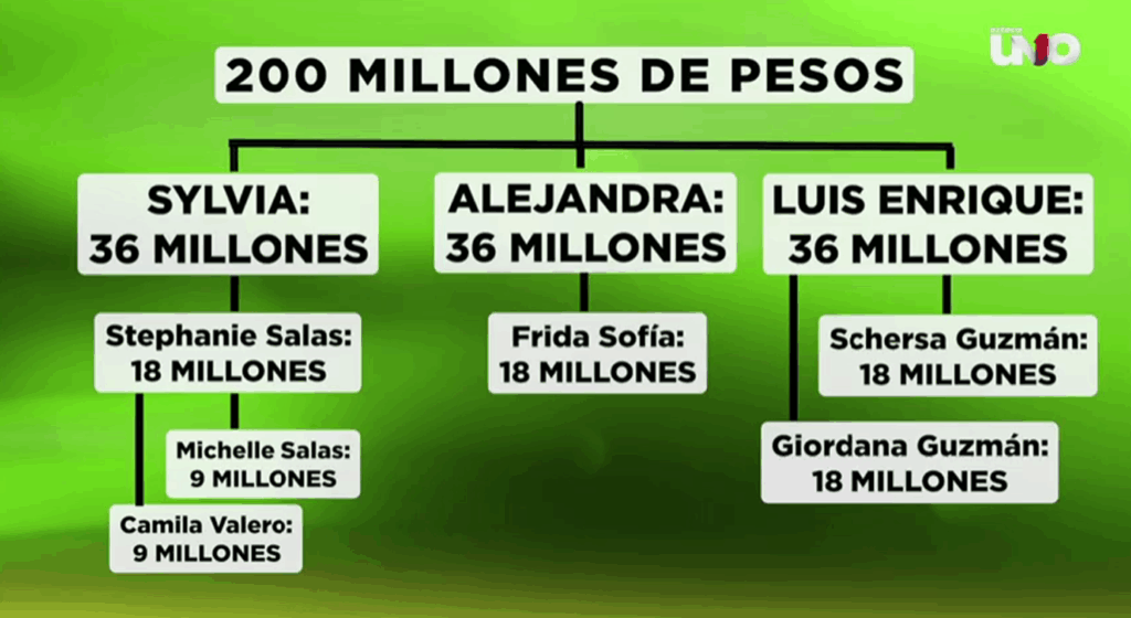 El reparto de la herencia ha sido el siguiente: cada uno de sus tres hijos recibió 36 millones de pesos, mientras que sus nietas Stephanie Salas y Frida Sofía, así como las descendientes de Luis Enrique Guzmán, Schersa y Giordana Guzmán, obtuvieron 18 millones cada una. Las hijas de Stephanie Salas, Michelle y Camila Valero, recibieron 9 millones cada una.