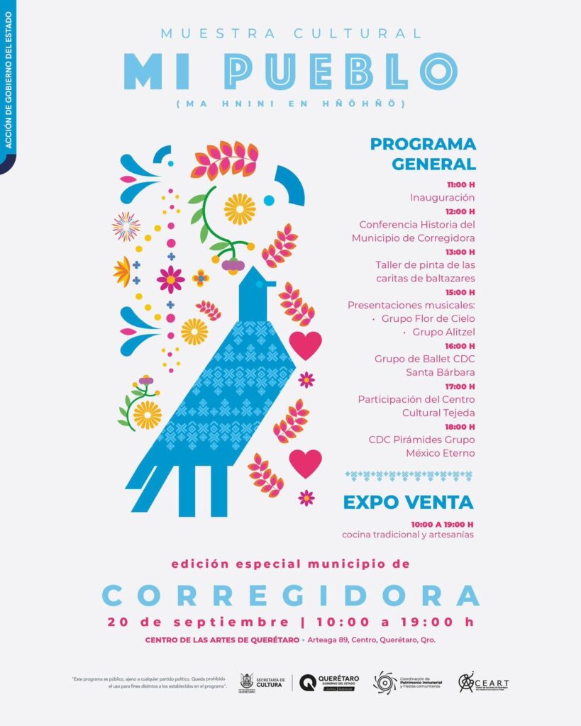 La Secretaría de Cultura del estado anunció que este sábado 20 de septiembre se llevará a cabo una muestra cultural dedicada al municipio de Corregidora. El evento, titulado “Mi Pueblo (Ma Hnini, en Hñöhñö)”, se realizará en el Centro de las Artes de Querétaro (CEART), con un horario de 10:00 a 19:00 horas, y será una jornada para reencontrarse con las raíces, la identidad y los saberes ancestrales de esa región.