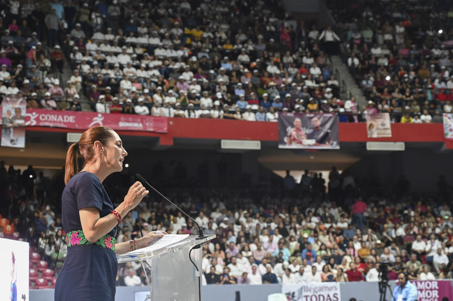 Durante el evento, la presidenta agradeció el cálido recibimiento de miles de sonorenses, aunque afuera del recinto se registraron protestas de habitantes del Río Sonora, quienes se manifestaron en contra de la construcción de presas que forman parte del Plan Nacional Hídrico.