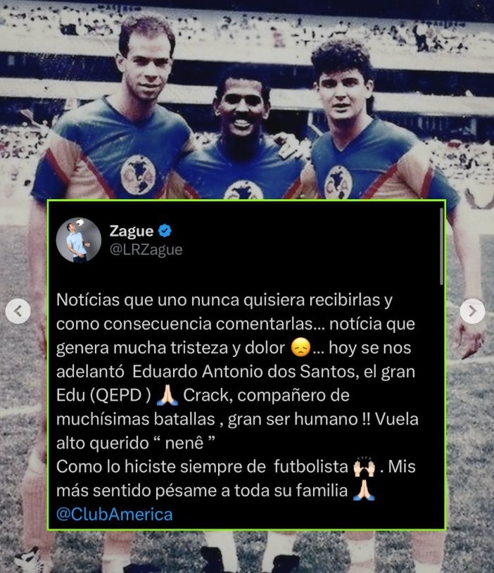 «El Club América lamenta el sensible fallecimiento de Eduardo Antonio Dos Santos ‘Edu’, leyenda del Club,» comunicó la institución en sus redes sociales, sin especificar la causa del deceso. El club se unió a las condolencias para familiares y amigos.
